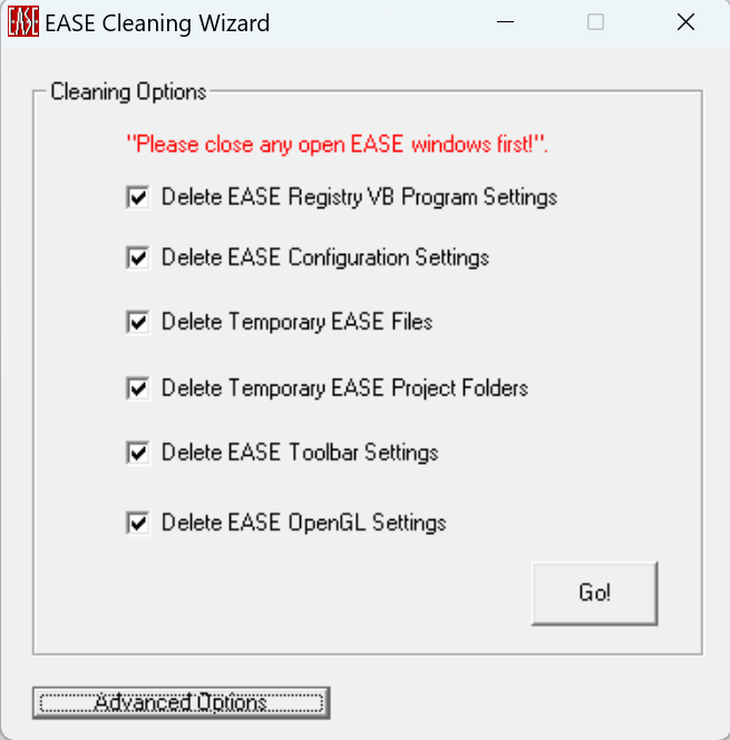 Select all the check boxes, including those in Advanced Options and then press the Go! button. Then try to start EASE again.