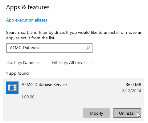 AFMG Database Service Error To fix the problem please go to the Windows Installed Apps control panel and look for AFMG Database Service. Uninstall it explicitly and the re-install EASE 5. Please let me know if you still encounter any issues.